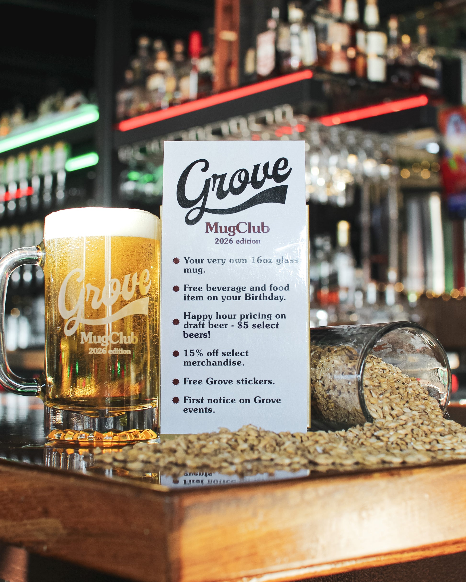When you become part of the Grove's Mug Club, we will keep your glass on display behind the bar for your private use. All our Mug Clubbers enjoy discounts on every glass they fill.